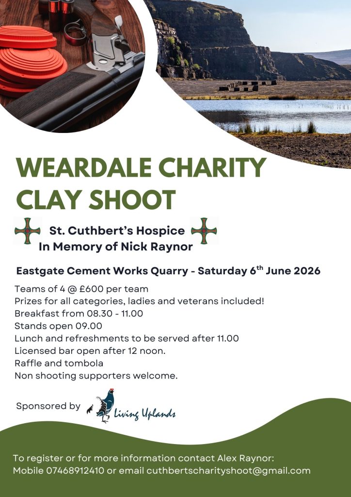 There is no-one in the community unaffected in some way by cancer. Everyone has a family member or friend who has had a diagnosis. For that reason, Living Uplands is pleased to support St Cuthbert’s Hospice, and specifically a Weardale Clay Shoot fundraiser to be held 6th June at the old Eastgate Cement Works Quarry.